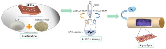 To achieve uniform nanoparticle coverage on biological carbon materials, a novel device was designed in this study. The synthesis route of Co@SP-C-a, as illustrated in Figure 1, involved several steps. Initially, the commercial soybean powder (SP) was immersed in a potassium chloride solution, freeze-dried, and pyrolyzed to obtain activated carbon materials. Subsequently, a mixture of SP-a, Zn2+, Co2+, and 2-methylimidazole (Hmim) in deionized (DI) water was stirred, followed by drying and carbonization to produce the final product, Co@SP-C-a.