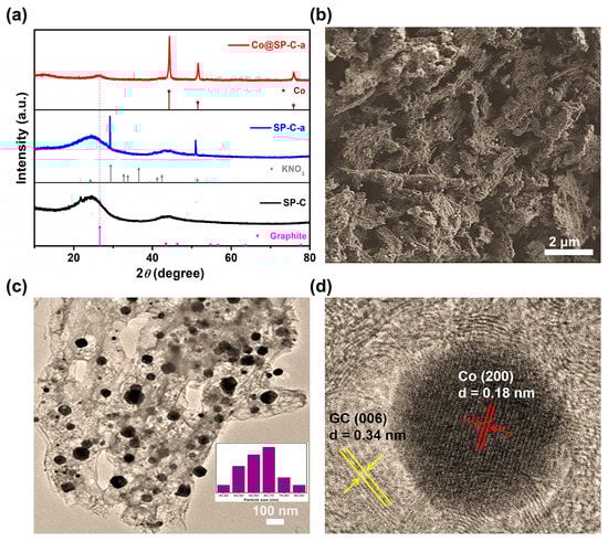 Next, the morphology of the as-prepared samples was analyzed using SEM. Firstly, the SEM image of SP-C revealed a surface with a concave and convex structure but without distinct pores (Figure S1). However, after KCl etching (SEM photographs of SP-C-a, Figure S2), an increase in the pore structure on the surface of SP-C-a was observed, indicating that KCl activation can indeed play a role in pore formation. Previous studies have reported that KCl not only protects the carbon structure from degradation at high temperatures, but also facilitates the formation of hierarchical porous structures during one-step carbonization, leading to a high specific surface area [20,29]. This hierarchical porosity could potentially enhance the exchange rate between the reaction products (such as oxygen) and electrolyte ions. Next, the SEM image and EDX mapping of the final Co@SP-C-a catalyst demonstrated a uniform distribution of Co elements (Figure 2b and Figure S3) through secondary high-temperature calcination while preserving the porous structure. The high-resolution TEM (HRTEM) image (Figure 2c) further provided additional evidence of the existence of a porous structure in Co@SP-C-a. According to the HRTEM image (Figure 2c), the surface of the final Co@SP-C-a catalyst was decorated with small inorganic quantum dots ranging from 30 to 90 nm in diameter, indicating the successful integration of the active inorganic species into the carbon material. Additionally, the high-resolution TEM (HRTEM) image (Figure 2d) revealed lattice fringe spacings of 0.18 nm and 0.34 nm, matching the Co metal (200) and graphite carbon (006) planes, respectively.
