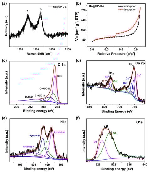 Raman spectra (a); the nitrogen adsorption/desorption isotherms (b); high-resolution XPS data for (c) C 1s, (d) Co 2p, (e) N 1s, (f) O 1s core levels of Co@SP-C-a.