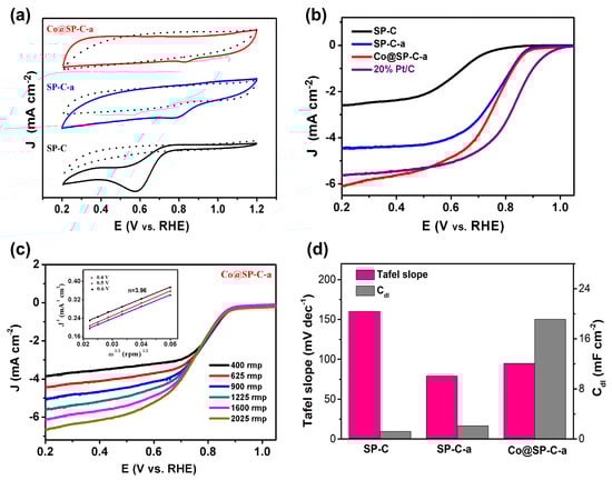 The electrocatalytic performance of the catalysts (SP-C, SP-C-a, and Co@SP-C-a) for ORR was evaluated using CV in 0.1 M potassium hydroxide saturated with oxygen and nitrogen at a scan rate of 50 mV/s (Figure 4a and Table S1). Among the catalysts tested, Co@SP-C-a exhibited a significantly more positive peak potential and the highest ORR activity. This observation suggests that the active ingredients in Co@SP-C-a play a crucial role in enhancing the catalytic activity for ORR [39]. These findings highlight the potential of Co@SP-C-a as a promising catalyst for ORR and warrant further investigation to understand the underlying mechanisms contributing to its superior performance.