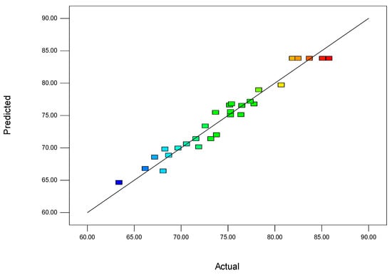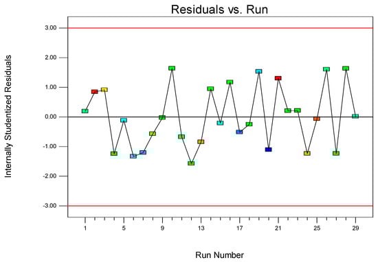 Figure 2 displays the internally studentized residuals corresponding to the 29 experimental runs. The plot reveals that the residuals exhibited irregular characteristics, indicating that the experimental errors stemmed from random fluctuations rather than systematic errors. Notably, the range of the internally studentized residuals remained within −2 to 2, suggesting that there were no significant outliers or faulty measurements in the experimental results. No residuals exceed −3 and 3, indicating the correctness of the fitting formula and the absence of significant residuals. This further supports the reliability and validity of the obtained data. The absence of residuals outside the −2 to 2 range indicates that the experimental results are consistent with the predicted values from the second-order model, confirming the overall robustness of the experimental setup and the accuracy of the desulfurization rate measurements.