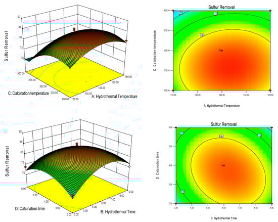 Analyzing Figure 3 further reveals that the contours formed between the hydrothermal temperature (A) and calcination temperature (C) are elliptical, but with small curvature. On the other hand, the contours between hydrothermal time (B) and calcination time (D) also appear elliptical, but with a larger curvature. This indicates that the interaction between hydrothermal temperature (A) and calcination temperature (C) is not significant, while the interaction between hydrothermal time (B) and calcination time (D) is pronounced. Hydrothermal temperature (A) and calcination temperature (C) can be considered independent of each other, without needing to account for their mutual influence. However, when dealing with the time conditions, attention should be given to the interaction between hydrothermal time (B) and calcination time (D), as it has a noticeable impact. Since the influence of hydrothermal time (B) on the desulfurization rate is relatively low, greater emphasis should be placed on considering the influence of calcination time (D) when determining the optimal preparation time conditions.