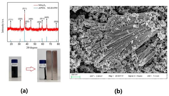 XRD (a) and SEM (b) images of NiCo2O4 powders.
