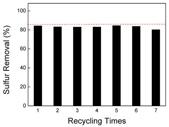 Figure 7 presents the experimental results of the desulfurization cycle using the prepared NiCo2O4 powders. The figure demonstrates that the desulfurization rate achieved with the NiCo2O4 powders is approximately 84%. Additionally, it can be observed that the activity of the powder remains consistent, even after six cycles, indicating its excellent recycling performance. Comparing the experimental desulfurization rate of 84% with the predicted value of 85.8% (red dash line), it can be deduced that the error between the predicted and actual values is only around 2.1%. This suggests that the predicted desulfurization rate obtained through the response surface method is highly accurate. The close agreement between the predicted and experimental results further validates the effectiveness and reliability of the response surface model in optimizing the preparation conditions for NiCo2O4 powders. The minimal error indicates the success of the optimization process and reinforces the suitability of the obtained conditions for achieving high desulfurization rates.