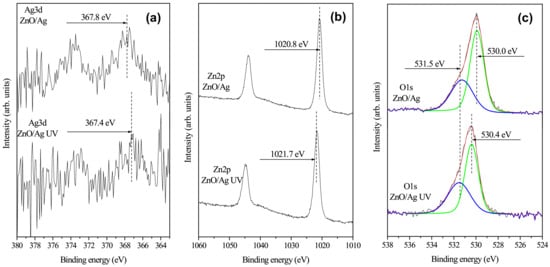 The difference of 0.4 eV can be attributed to the presence of a very low concentration of Ag+, resulting in noisy curves. Figure 3b provides a comparison of the measured Zn2p energy ranges measured for both samples. The measured BEs are 1020.8 eV (Ag/ZnO) and 1021.7 eV (Ag-UV/ZnO), respectively, indicating the presence of the +2 oxidation state of zinc in both samples, in accordance with ZnO [12,23]. The Zn2p spectra exhibit high quality. Therefore, an alternative explanation is required for the BEs discrepancy. Upon closer examination of Figure 3a,b, it becomes apparent that the BE of Ag3d5/2 is higher in the Ag/ZnO sample compared to the BE of Ag3d 5/2 in the Ag-UV/ZnO sample. Similarly, the BE of Zn2p3/2 is lower in the Ag/ZnO sample compared to the BE of Zn2p3/2 in the Ag-UV/ZnO sample. Moreover, a similar trend is observed for the O1s peak. In both samples, the O1s peak has been deconvoluted to two subpeaks representing Zn-O bonds with BEs of 530.0 eV and 530.4 eV for Ag/ZnO and Ag-UV/ZnO, respectively, and oxygen vacancies with a BE of approx. 531.5 eV [12,23]. Remarkably, the difference in BE for Zn-O bonds is 0.4 eV, but in the opposite direction. When the Ag3d exhibited a 0.4 eV higher value, the O1s peak showed a 0.4 eV lower value and vice versa.