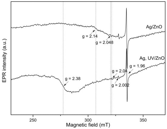 Furthermore, differences in the EPR spectra between Ag/ZnO and Ag-UV/ZnO samples are noticeable. In the Ag/ZnO sample, a very weak EPR signal is detected at g = 2.048, potentially associated with absorbed oxygen O2−. Moreover, a signal recorded at g = 2.14 in the same sample is probably attributed to Zn vacancy [28].
