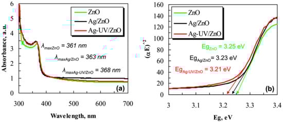 Figure 5a represents the UV–Vis optical absorbance spectra of three samples—pure ZnO and the silver-modified samples without the UV illumination aid (Ag/ZnO) and with the UV illumination aid (Ag-UV/ZnO). The spectra exhibited peaks at wavelengths of 361, 363 and 368 nm for ZnO, ZnO/Ag, and Ag-UV/ZnO, respectively.