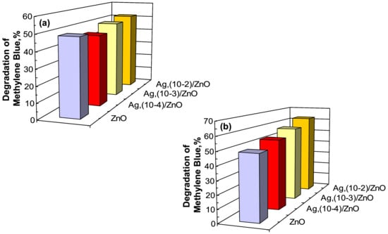 The photocatalytic degradation of methylene blue using the three different photocatalyst samples is shown in Figure 7. After 4 h of stirring under UV light illumination, the Ag-modified nanostructure films, treated photo-fixed without UV irradiation (Ag/ZnO), exhibit a lower degradation rate compared to the pure zinc oxide (Figure 7a). This observation can be attributed to the fact that the co-catalyst does not undergo further excitation, leading to the blocking of the ZnO surface active centers. However, in the case of Ag-UV/ZnO films, a linear increase in efficiency was observed with an increase in the Ag co-catalyst concentration during the treatment step (Figure 7b). Therefore, the silver ions photo-fixation products act as highly efficient electron traps and improve the Ag/ZnO couple as a catalyst for methylene blue degradation.