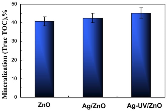 The results obtained from the Total Organic Carbon (TOC) analysis (Figure 8) indicate that the pure ZnO films have a lower percentage of MB mineralization in comparison with silver-modified ones. In the case of the Ag-UV/ZnO catalyst, the highest percentage of TOC of mineralization of the dye is observed with the respective values of 40.73% for ZnO, 42.57% for Ag/ZnO, 45.23% for Ag-UV/ZnO. Furthermore, the TOC values for methylene blue are consistently lower than the ones obtained via UV–Vis spectroscopy during the photocatalytic experiments, which can be attributed to the formation of non-absorbing intermediate products that cannot be registered in the UV–Vis absorbance spectra.