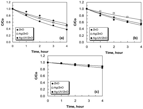 Figure 9 shows the concentration profiles of methylene blue removal by ZnO and Ag (10−2 M)/ZnO at different types of light illumination. The dye spectrum decreases with the time of illumination. As expected, the concentration of the dye decreases most rapidly under UV light, followed by the visible, and finally in darkness, where only adsorption of dye molecules is expected to occur. Furthermore, for the silver-modified catalysts, UV light illumination also leads to a decrease in the recombination level of the photogenerated charges. Upon irradiation with visible light, silver ions are unable to significantly prevent the loss of quantum yield.