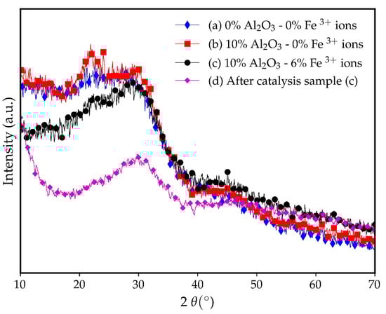 Powder PXRD analysis for borophosphate glass with (mol) (a) 0% Al2O3 and 0% Fe3+ ions, (b) 10% Al2O3 and 0% Fe3+ ions, and (c) 10% Al2O3 and 6% Fe3+ ions and (d) sample (c) after catalysis.