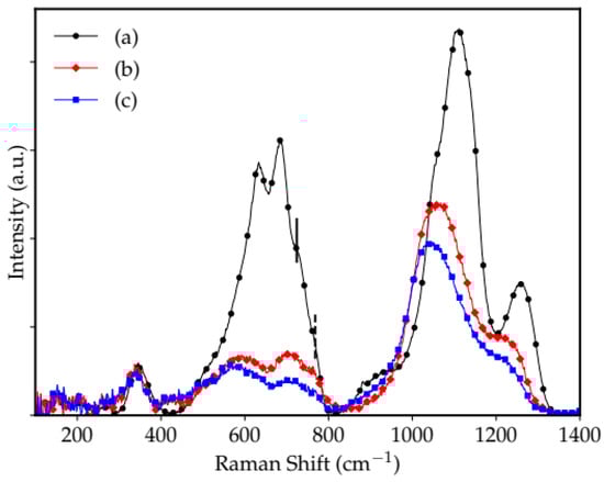 Raman spectrum for borophosphate glass (in mol%) (a) 0% Al2O3 and 0% Fe3+ ions, (b) 10% Al2O3 and 0% Fe3+ ions, and (c) 10% Al2O3 and 6% Fe3+ ions.