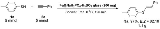 Firstly, the optimal temperature for the hydrothiolation reaction was evaluated using catalytic amounts of Fe@NaH2PO4-H3BO3 glass (10 mg). At 0 °C, the desired product 3a was synthesized in a good yield, with high stereoselectivity (entries 1−4). Next, we evaluated the catalyst loading for the reaction. When the amount of the catalyst was decreased to 5 mg, the stereoselectivity was high (E/Z ratio = 90:10), but the yield of 3a was only 65% (entry 5). In the same way, when the loading of catalyst was increased to 15 mg, 3a was synthesized in 60% yield, with very poor stereoselectivity (entry 6). As such, 10 mg (approximately 4.3 mol % of Fe2O3) was the most appropriate catalyst load for this reaction, where the desired product was synthesized in 80% yield and with high stereoselectivity (entry 2).
