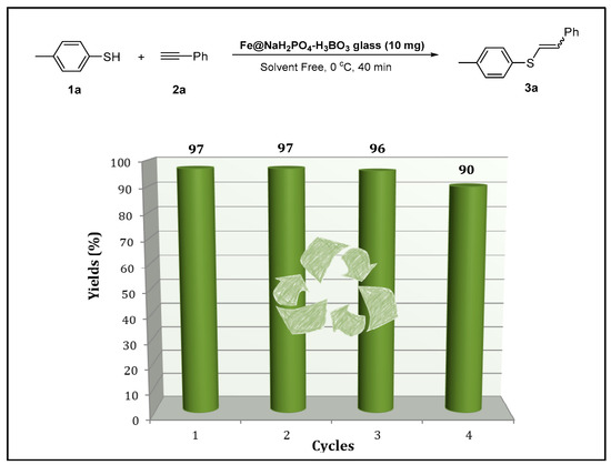 In addition, solvent-free reactions are attractive alternatives in organic synthesis and are considered an important contribution to the evolution of green chemistry [33,34]. Based on our interest in developing new sustainable materials and eco-friendly processes for organic reactions and material sciences [35,36,37,38,39,40], we describe herein the synthesis of a cheap and readily available iron-borophosphate glass and its application as a recyclable catalyst for the synthesis of vinyl sulfides. This novel approach worked smoothly under solvent-free conditions in a significantly short reaction time.