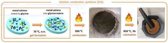 Schematic solution combustion synthesis procedure. (i) glycine is added to the solution of metal cations; then, water is evaporated overnight at 70 °C to form a gel; (ii) temperature is risen to 300 °C to ignite the combustion of the gel and form precursors ashes in the form of a black powder; (iii) the obtained brown oxide powder indicates the final perovskite formation, which is obtained after calcination at 850 °C for 5 h.