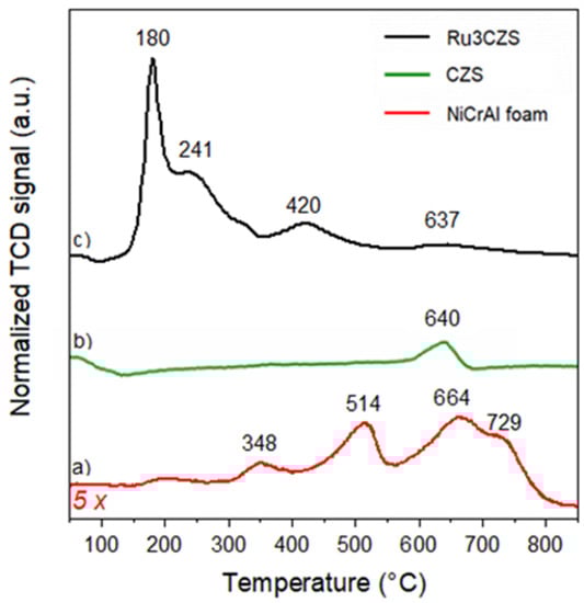 The temperature–programmed reduction (H2–TPR) measurements from room temperature to 850 °C were performed to determine the redox properties of NiCrAl foam (profile a), Ru–free CZS powder (profile b) and Ru3CZS powder (profile c). In Figure 4, the H2–TPR profile of NiCrAl foam (profile a) is shown. The observed hydrogen consumption peaks are associated with the reduction of the different oxides in the passivated surface layer, such as α–Al2O3, Cr2O3, NiCr2O4 spinel, and traces of NiO. The profile shows two peaks at 348 °C and 514 °C and two overlapping high–temperature peaks at 664 °C and 729 °C. As reported in our previous work [], the first two peaks are likely associated to chromium oxides reduction, while the last two are attributed to the Ni oxides reduction.
