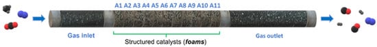 The catalytic test of DRM was carried out in a fixed–bed quartz reactor using a catalytic bed with 11 foams, as schematically reported in Figure 5. The foams are named A1–A11, going from the inlet to the outlet of the reactor. A preliminary investigation (not reported) showed that the uncoated foams were not catalytically active under the same experimental conditions.