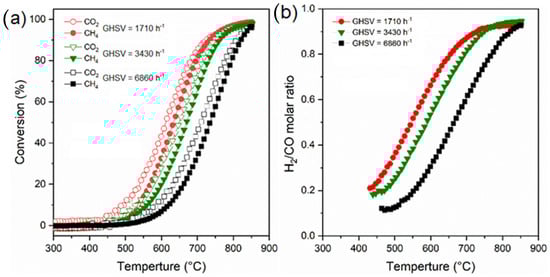Figure 6a shows the CH4 and CO2 conversions and Figure 6b shows the H2/CO molar ratio as a function of temperatures at different GHSVs. At all investigated temperatures, the conversion of CO2 was favored over that of CH4 but the difference between CO2 and CH4 became smaller with increasing temperature. The CH4 conversion increased with increasing temperature, reaching a maximum of 98% at 850 °C for all GSHVs, which corresponds to the thermodynamic value. Both CO2 and CH4 conversion decrease with increasing GHSV. As already reported in the literature [,,], DRM is better promoted at low GHSV when the effect of mass transfer limitation is negligible.