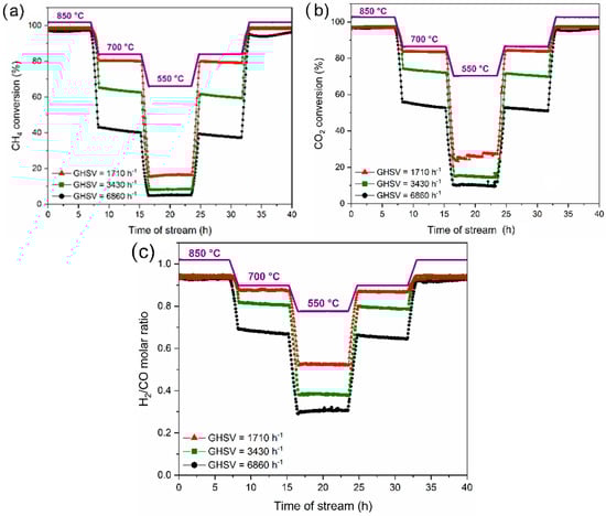 CH4 and CO2 conversion (%) vs. time of stream at different GHSVs are shown in Figure 7a,b, while Figure 7c displays the H2/CO molar ratio.