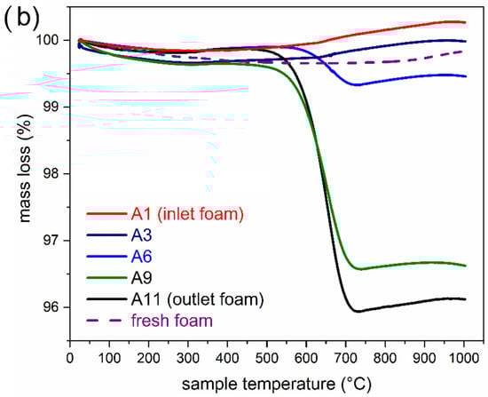 (a) Scheme of packed reactor with labels, positions of the foams and micrographs of A1, A3, A6, A9, and A11 foams; (b) mass loss (%) of A1, A3, A6, A9, A11 between 25 and 1000 °C.