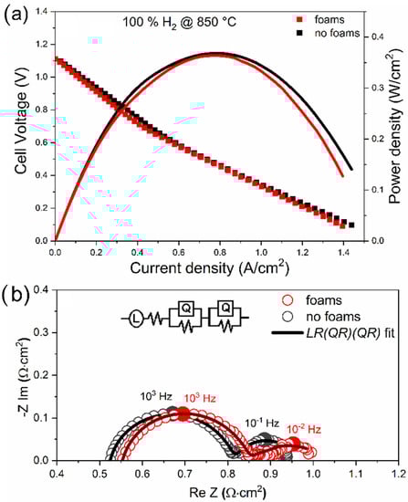 (a) I–V and power density curves of the SOFC apparatus tested at 850 °C in dry hydrogen, with (red) and without (black) the structured catalysts; (b) Nyquist plot with EIS data recorded at open circuit for the cells tested in (a). Data were fitted with an equivalent LR(QR)(QR) circuit, which is depicted in the upper part of the panel.