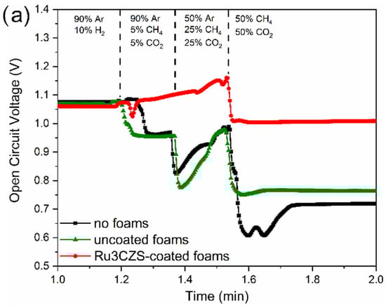 After the reduction in pure hydrogen, argon was used as a buffer before switching to the methane and carbon dioxide mixture. To better investigate the role of the Ru3CZS catalyst in the DRM reaction, the complete system (Ru3CZS–coated foams + SOFC) was tested and compared to the catalyst–free system (uncoated–foams + SOFC) and to the SOFC alone. The open circuit voltage (OCV) variation upon gas switch was monitored vs. time, and the results are shown in Figure 11a. In the starting 90% Ar + 10% H2 initial mixture, the OCV was around 1.06 V for the three samples. Upon gas switch, a severe lowering down to 0.72 V and 0.76 V was observed for the system without foams and with uncoated foams, respectively. This low OCV value may result from methane cracking occurring at the anode surface [,]: the slightly higher value observed for the system containing the uncoated foams may result from Ni in the NiCrAl alloy contributing to methane activation. Otherwise, an OCV of 1.01 V was observed with the Ru3CZS–coated foams, which, according to the Nernst equation, is the voltage expected for SOFC operation in a H2:CO mixture at 850 °C. Figure 11b shows the I–V and power density curves for the three different systems working in the DRM mixture. Although the recorded power density range in CH4:CO2 was significantly lower as compared to operation in 100% H2, the presence of the structured catalysts allowed for a 68% increase in MPD, obtaining 137 mW/cm2. Interestingly, the power density values observed for the SOFC alone and the system including the uncoated foams were similar to each other. Figure 11c shows the comparison of EIS spectra obtained with the complete IIR–SOFC system (Ru3CZS–coated foams + cell) in 100% H2 and in 50% CH4 / 50% CO2. Rohm was set to 0 to ease the comparison between polarization resistances. The Rpol increase upon gas switch was mainly attributed to the higher frequency arc, which was 36% larger in the DRM mixture than in pure hydrogen, while the lower frequency one was negligibly affected. This latter aspect can be attributed to a slower electrode polarization, as CO is also present in the reformed mixture that reaches the anode.