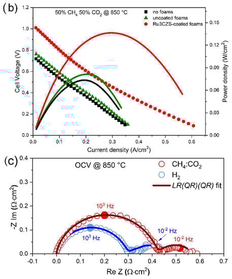 (a) Open circuit voltage vs. time trends upon switching the gas feed from hydrogen to DRM mixture (50% CH4 + 50% CO2) for: the SOFC alone (black), the uncoated foams + SOFC (green), the Ru3CZS–coated foams + SOFC (red); (b) I–V and power density curves of the three systems described in (a) tested at 850 °C in DRM mixture; (c) EIS spectra comparison for the complete IIR–SOFC system tested at open circuit in 100% H2 (blue) and DRM mixture (red). Data were fitted with an equivalent LR(QR)(QR) circuit, ohmic resistance was set to 0 to ease Rpol comparison.