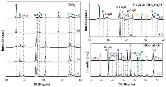 Alumina (Al2O3) could be utilized with TiO2 to improve the mechanical properties of TiO2 coatings [,]. Among different alumina phases, the stable corundum phase (α-Al2O3) presents high chemical stability, high electrical resistance, and good thermal and mechanical properties [].
