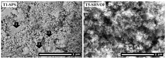 Top surface SE FESEM micrographs of T1-SPS and T5-SHVOF at high magnification, where (1) fully melted particles, (2) unmelted agglomerated particles, and (3) resolidified particles.