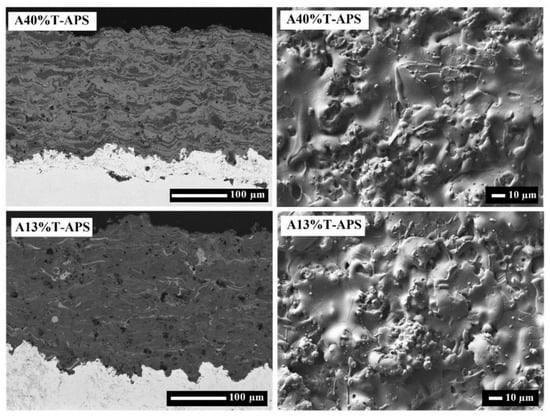 In Figure 3, the APS coatings also demonstrate comparable microstructures characterized by a typical lamellar arrangement. The lamellar structure results from the flattening of melted or partially melted inflight particles forming splats []. Other features that are observed in the APS coatings microstructure include the interlamellar pores and cracks and macro-pores [,].