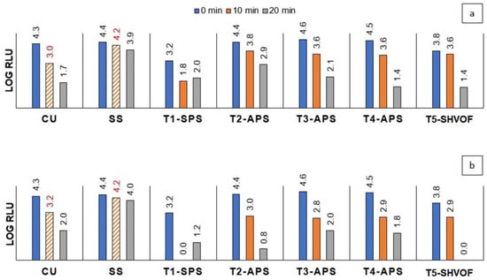 In Figure 11a,b, C-SPS and TC-SPS coatings demonstrate a relatively similar antiviral activity under both UVA and ambient lights, almost comparable to or slightly higher than that of the pure copper control sample. The Log RLU value of TC-SPS at 0 min shows that the quantity of re-collected virus was lower than C-SPS. The lower quantity of re-collected virus is due to the high porosity observed on the surface of TC-SPS shown in Figure 9. Therefore, the antiviral performance in TC-SPS could be linked to the combined effects of photocatalytic reactivity of TiO2, penetration of the virus below the top surface of the coating due to porosity, and direct contact with Cu2O. However, as seen in Figure 8, the Cu species are enveloped by TiO2, which might have limited the antiviral activity due to the reduced direct contact with solid-state Cu2O.