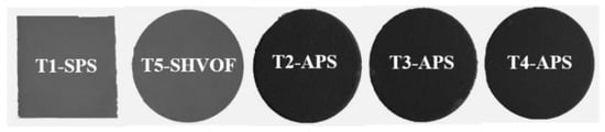 Likewise, in samples T2-APS, T3-APS, and T4-APS, the antiviral activity could be explained through a combined effect of several parameters. Figure 10 shows the color of the TiO2 coatings produced with different thermal spray processes. It is seen that the APS coatings are much darker than SPS and S-HVOF coatings. It was shown previously that the darker the sub-stoichiometric TiO2−x coating in SPS coatings, the higher the oxygen vacancy content [,]. Furthermore, the level of darkness in sub-stoichiometric coatings is related to the concentration of the Ti3+ ions [,,].