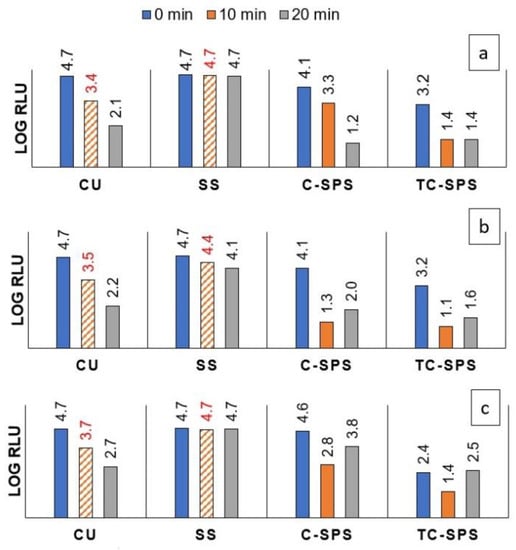 Figure 11c shows the antiviral activity of C-SPS and TC-SPS in dark conditions. It seems that the antiviral activity of C-SPS coating in the dark is lower than that that under UVA and ambient light. This outcome was not unexpected, since the direct-contact virus-killing mechanism in Cu2O is independent of photon energy [,].