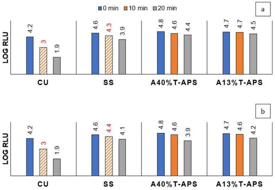 Antiviral activity assessment of TiO2 coatings under (a) ambient light, (b) UVA light. Cu-10 min and SS-10 min were calculated by linear interpolation.