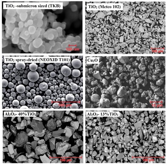 Submicron-sized TiO2 (TKB Trading, Oakland, CA, USA), micron-sized TiO2 (Metco 102-Metco Oerlikon, Fort Saskatchewan, AB, Canada), nanostructured TiO2 spray-dried (NEOXID T101 nano, Millidyne, Finland), Cu2O (PI-KEM, Tamworth, UK), Al2O3-40%TiO2 (Amdry 6257-Metco Oerlikon, Fort Saskatchewan, AB, Canada), and Al2O3-13%TiO2 (Metco 130-Metco Oerlikon, Fort Saskatchewan, AB, Canada) powders were used as feedstock materials to deposit coatings. SEM micrographs of the feedstock powders are shown in Figure 13. A diverse range of powder sizes is essential in the context of the different thermal spray processes. In the APS process, powders with particle sizes ranging from 10 to 100 µm are commonly used to avoid injection clogging []. On the other hand, sub-micron-sized powders are used in the SPS system.