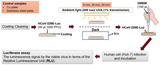 HCoV-229E-Luc stocks containing 1000 Plaque-Forming Units (PFUs) were prepared in Dulbecco’s Modified Eagle Medium (DMEM) containing 2% Fetal Bovine Serum (FBS). First, 50 µL of the virus solution was put on the surface of the coatings. The coatings were exposed to ambient/UVA light or kept in the dark. The virus was recollected from the coating surface by pipetting 100 µL of media (Dulbecco’s Modified Eagle Medium) at the coating’s surface at three time points of 0 min, 10 min, and 20 min after exposure. A fresh coating was used for the test at each time point. The retrieved virus was then used to infect Huh7 cells in triplicates. Huh7 cells are human epithelial liver cell lines derived from hepatoma tissue, which supports HCoV-229E replication. A Renilla-Glo Luciferase Assay System (catalogue number E2720, Promega), with a Perkin Elmer plate reader (Ensight, Perkin Elmer), was used to quantify virus infection in terms of relative luminescence unit (RLU), and the logarithmic value of the average of the triplicate RLU measurements was reported. Furthermore, a copper plate (Cu), with high antiviral activity, and a stainless steel 304 plate (SS) with no antiviral activity were used as positive and negative control samples, respectively [,]. The antiviral activity of each coating can be determined by comparing its activity at 20 min to the activity of the same coating at 0 min. Subsequently, the antiviral activity of the coatings was compared to that of the control samples. For each day of the antiviral activity assessment experiment, independent control samples were used. The antiviral activity of the control samples followed a consistent trend during the whole duration of the experiment. To compare the results from the tests carried out on different days, the average values of the activity of the control samples were used. The schematic of the antiviral activity assessment process is shown in Figure 15.