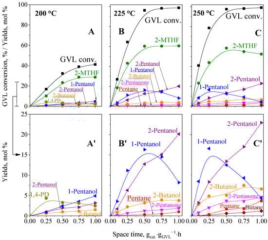 - Al-Shaal, M.G.; Dzierbinski, A.; Palkovits, R. Solvent-free γ-valerolactone hydrogenation to 2-methyltetrahydrofuran catalysed by Ru/C: A reaction network analysis. Green Chem. 2014, 16, 1358–1364. [Google Scholar] [CrossRef]