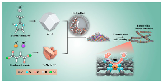 Among all the available NPMCs, transition metal-nitrogen-doped carbon (M-N-C, M = Fe, Co, Mn, Ni and Cu) is regarded as one of the most promising substitutes for the PGMs for ORR [9,10,11,12]. Of specific interest are highly dispersed M-N-C catalysts, which possess maximum atomic utilization of active sites [13]. Over the past few years, atomically dispersed Fe-based catalysts have attracted extensive interest [14,15]. For instance, significant breakthroughs in ORR performance using non-macrocycle precursors to prepare the Fe-Nx-C catalysts were reported by Li et al. [16]. But the Fenton-like reaction involving the Fe sites seriously affects the catalytic activity and stability of Fe single-atom catalysts. The addition of second metal elements (such as Co, Ni, Mn, Cu, Zn, etc.) into the Fe–Nx structure to boost the ORR activity is a common topic of investigation [17,18,19,20,21]. Theoretic and experimental studies have shown that the synergistic effect of bimetallic active sites can reduce the potential barrier of O–O breaking, resulting in higher ORR activity [22,23]. For example, Li et al. proposed a post-synthesis encapsulation strategy by pyrolyzing FeCl3-encapsulated Zn/Co bimetallic ZIF-8 [24]. The resulting (Fe, Co)/N-C catalyst showed a comparable ORR activity with that of commercial Pt/C in an acid medium. Recent reports indicate that the doping of Mn–Nx species can adjust the electronic spin configuration in Fe sites, resulting in an enhanced ORR activity [25,26,27,28]. Atanassov et al. prepared a series of FeCo-, FeCu-, FeNi- and FeMn-N/C bimetallic catalysts by a sacrificial support method [29]. The results showed that all catalysts had similar surface area and pore structure, but only the FeMn-N/C catalyst showed higher ORR activity than the Fe-N-C catalyst in acidic medium. Moreover, the M/N/C catalysts with a unique carbon structure are also important for the enhancement of ORR performance. Many kinds of 1D to 3D carbon supports, such as carbon nanofibers/nanotubes, graphene, MXenes, and MOFs/biomass-derived hierarchically porous carbon, have been developed for use in enhanced ORR catalysts [30,31,32,33]. Among them, it has been reported that use of carbon nanotubes with nitrogen doping is beneficial for the formation of cross-linked conductive networks, stabilizing the metal atoms and restraining their aggregation [34]. Specifically, the carbon nanotubes with a bamboo-like structure exhibit more defects and specific areas, which enables the introduction of abundant M–Nx moieties [35,36,37]. However, use of bamboo-like carbon nanotubes with dual-metal atomically dispersed metal sites for efficient M/N/C catalysts is rarely reported.