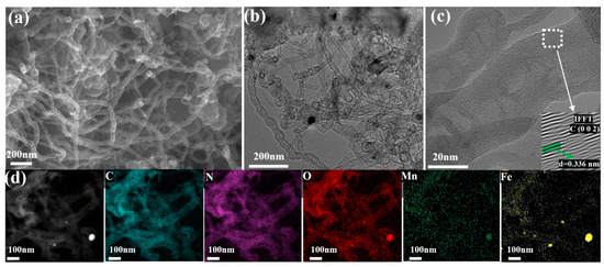 (a) SEM image, (b) TEM image, (c) high-resolution TEM image (the inset is an IFFT image of the marked region), and (d) EDS mapping images of Z-Fe1Mn1-NC.