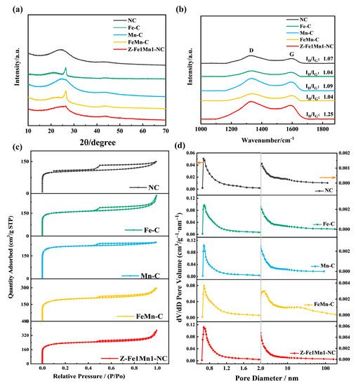 (a) XRD patterns, (b) Raman spectra, (c) N2-adsorption/desorption isotherm and (d) pore size distribution of NC, Fe–C, Mn–C, FeMn–C, and Z-Fe1Mn1-NC.