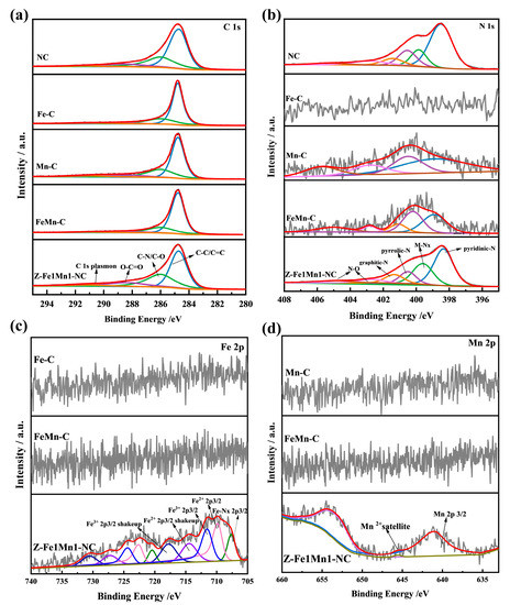 High-resolution XPS spectra of (a) C 1s and (b) N 1s for NC, Fe–C, Mn–C, FeMn–C, and Z-Fe1Mn1-NC. (c) High-resolution XPS spectra of Fe 2p for Fe–C, FeMn–C, and Z-Fe1Mn1-NC. (d) High-resolution XPS spectra of Mn 2p for Mn–C, FeMn–C, and Z-Fe1Mn1-NC.