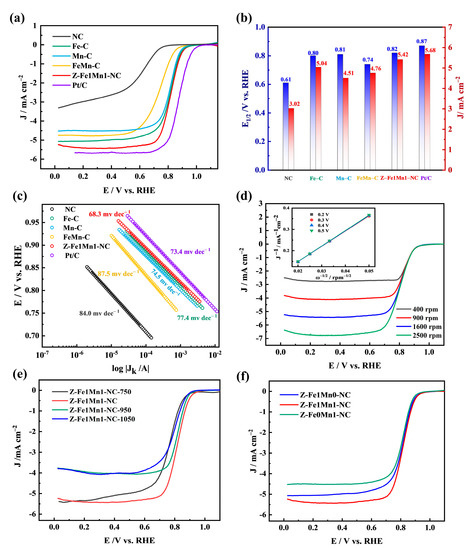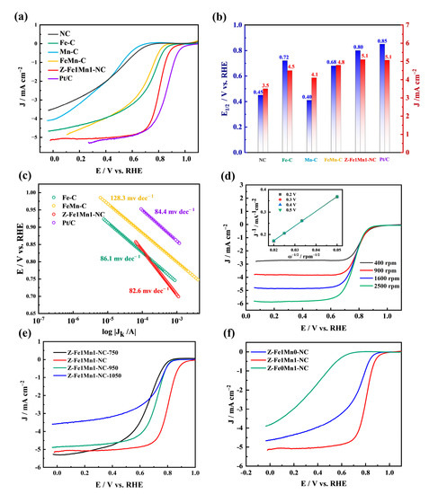 The catalytic ORR performance of the prepared samples was initially evaluated by a rotating disk electrode (RDE) method in 0.1 M KOH. As seen in Figure 5a, the linear sweep voltammetry (LSV) curve (under a rotational speed of 1600 rpm) of Z-Fe1Mn1-NC shows superior ORR properties, with an onset potential (E0) of 1.02 V, half-wave potential (E1/2) of 0.82 V, and diffusion limited current density (JL) of 5.42 mA cm−2. It is also higher than those of NC (E1/2 = 0.61 V, JL = 3.02 mA cm−2), Fe–C (E1/2 = 0.80 V, JL = 5.04 mA cm−2), Mn–C (E1/2 = 0.81 V, JL = 4.52 mA cm−2) and FeMn–C (E1/2 = 0.74 V, JL = 4.76 mA cm−2) (Figure 5b). Moreover, the Z-Fe1Mn1-NC exhibits slightly lower E1/2 and higher JL compared to a commercial Pt/C catalyst (E1/2 = 0.87 V, JL = 5.68 mA cm−2). Additionally, Z-Fe1Mn1-NC also displays excellent ORR kinetics, as evidenced by having the smallest Tafel slope, 68.3 mV dec−1, comparable to those of NC (84.0 mV dec−1), Fe–C (77.4 mV dec−1), Mn–C (74.5 mV dec−1), FeMn–C (87.5 mV dec−1), and Pt/C (73.4 mV dec−1) (Figure 5c). To give insight into the reaction routing of Z-Fe1Mn1-NC, the LSV measurements at different rotation speeds of 400–2500 rpm were performed (Figure 5d). The corresponding K-L plots exhibit excellent linearity at different potentials, implying a first-order ORR reaction kinetic of Z-Fe1Mn1-NC. And the electron transfer number is calculated to be 3.94, further confirming a direct four-electron pathway. Moreover, the effect of pyrolysis temperature on ORR performance was investigated. As displayed in Figure 5e and Figure S6, the catalyst prepared at T = 750 °C shows the lowest ORR activity, with a E1/2 of 0.76 V and Tafel slop of 88.0 mV dec−1. As the temperature was elevated to 850 °C, the Z-Fe1Mn1-NC possessed a significantly enhanced activity. Along with the rise of the pyrolysis temperature to 950 °C and 1050 °C, the ORR performance was gradually decreased. These results indicating that 850 °C is the optimal temperature. To verify the synergistic catalytic effect of Fe and Mn, the ORR performance of comparison samples derived from ball-milled ZIF-8 and Fe or Mn-MOF is further evaluated. As analyzed from Figure 5f, Z-Fe1Mn0-NC and Z-Fe0Mn1-NC demonstrate 10 mV more negative positive E1/2 than Z-Fe1Mn1-NC. And the Tafel slope of Z-Fe1Mn0-NC (70.1 mV dec−1) and Z-Fe0Mn1-NC (81.4 mV dec−1) are larger than that of Z-Fe1Mn1-NC, which confirms the fast ORR kinetics of the bimetallic catalyst (Figure S8). Then, the same analytical method was applied to evaluate the acidic ORR activity of the catalysts. As shown in Figure 6a,b, the E1/2 and JL of Z-Fe1Mn1-NC were 0.80 V and 5.1 mA cm−2, respectively, which demonstrates superior activity compared to NC, Fe–C, Mn–C, and FeMn–C. The ORR activity of Z-Fe1Mn1-NC is slightly inferior to that of Pt/C in acidic media, with a 50 mV difference in E1/2. Remarkably, the Z-Fe1Mn1-NC displays the same limited current density, as well as the Pt/C electrode. Additionally, the Z-Fe1Mn1-NC delivers the smallest Tafel slope of 82.6 mV dec−1, further confirming its ORR kinetics (Figure 6c). And the number of transferred electrons attained from the K-L equation for Z-Fe1Mn1-NC is determined to be 4.02, illustrating its ultrahigh selectivity for 4e− ORR pathway in acid (Figure 6d). Moreover, the influence of pyrolysis temperature and bimetal MOF on the ORR performance reveals a similar law with the alkaline condition (Figure 6e,f and Figure S9).