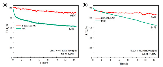 Current–time chronoamperometric response of Z-Fe1Mn1-NC and Pt/C at 0.7 V vs. RHE, with a rotating speed of 900 rpm in O2-saturated 0.1 M KOH (a) and 0.1 M HClO4 (b).