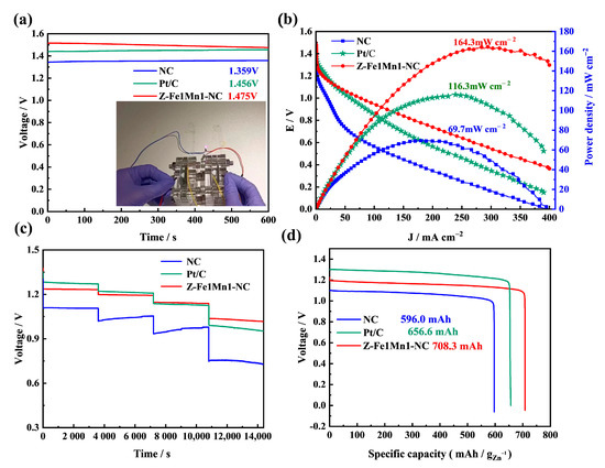 Performances of liquid ZABs: (a) open circuit voltage curves (the inset is the photograph of two ZABs powering a LED light), (b) discharge polarization and power density curves, (c) voltage-specific capacity curves at 10 mA cm−2, and (d) discharge curves of at different current densities of ZABs with NC, Z-Fe1Mn1-NC and Pt/C as the air cathode catalysts.