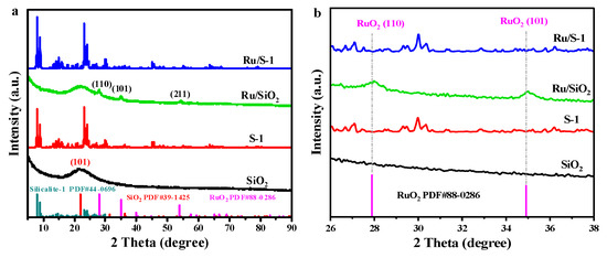 From the XRD patterns shown in Figure 1, S-1 and Ru/S-1 catalysts show typical diffraction peaks of MFI zeolites, and five characterization diffraction peaks of MFI structure were found at 2θ = 7.96, 8.82, 23.27, 23.77, and 23.97° in S-1 and Ru/S-1 catalysts (Figure 1a), indicating that the MFI structure is maintained during the synthesis [28]. The intensity of diffraction of peaks (2θ = 7.96 and 8.82°) increases after the introduction of the Ru species, implying an enhanced crystallinity for S-1 and Ru/S-1. The Ru/SiO2 catalyst shows diffraction peaks about RuO2 species (Figure 1b), suggesting that the Ru species of the Ru/SiO2 catalyst shows poor dispersion. For the Ru/S-1 catalyst, no diffraction peaks attributed to the crystal structure of Ru or RuOx were detected, indicating that Ru species were highly dispersed in the Ru/S-1 catalyst.