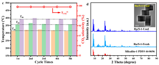 (a) Soot conversion percentage, (b) CO2 selectivity, (c) Stability test results of the Ru/S-1 catalyst, and (d) XRD patterns and TEM image of the used Ru/S-1 catalyst.