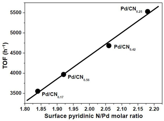 Correlation between molar ratio of surface pyridinic N/Pd and TOFinitial value with Pd/CNx catalysts. Reprinted with permission from Ref. [87]. Copyright 2016, Wiley.