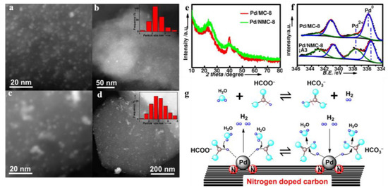 STEM images of (a,b) Pd/NMC-8 and (c,d) Pd/MC-8. (e) XRD patterns and (f) Pd 3d XPS spectra of Pd/MC-8 and Pd/NMC-8. (g) Probable reaction mechanisms for formate dehydrogenation and bicarbonate hydrogenation over Pd/NMC. Reprinted with permission from Ref. [88]. Copyright 2016, Wiley.