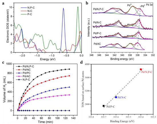 In 2020, Shao, Ji, et al. prepared N,P-co-doped porous carbon through the pyrolysis of a 1,10-phenanthroline and triphenylphosphine mixture to immobilize Pd NPs [90]. The resulting Pd/N,P-C catalyst displayed good catalytic performance for H2 generation from HCOOK (TOF = 3248 h−1, 80 °C) and KHCO3 hydrogenation (TOF = 2805 h−1, 80 °C, 8 MPa H2). DFT studies and XPS analysis revealed that the good activity of the Pd/N,P-C was ascribed to the electron-rich Pd, which was regulated by N- and P-containing electron-donating groups doped into the carbon support (Figure 5a–d). In addition, the Pd/N,P-C showed good stability in five dehydrogenations and three hydrogenation reactions, respectively, and no deactivation was observed.