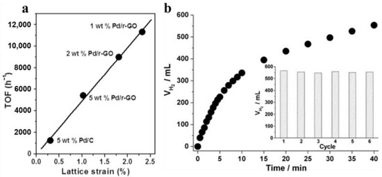 Cao and co-workers reported that Pd NPs anchored by reduced graphite oxide (r-GO) could efficiently decompose a potassium formate (HCOOK) aqueous solution with a TOFinitial of 11,299 h−1 at 80 °C [91]. Pd/r-GO can also catalyze the hydrogenation of potassium bicarbonate (KHCO3) with a TOF of 242 h−1 at 100 °C. The highly efficient H2 charge/discharge over Pd/r-GO was ascribed to the lattice microstrain of Pd derived from the lattice mismatch between Pd and r-GO. As displayed in Figure 6a, a positive correlation between lattice expansion and dehydrogenation activity was identified. Noteworthy, they realized the reversible conversion of HCOOK and KHCO3 in a single reaction vessel over the single catalyst (Pd/r-GO), indicating that a rechargeable formate-based H2 storage system had been built. As shown in Figure 6b, the Pd/r-GO catalyst also showed long-term stability; the original HCOOK can be wholly decomposed after storing the catalyst-containing charged solution system under environmental conditions for 4 months. The Pd/r-GO catalyst also exhibited excellent recycling stability; six consecutive dehydrogenation and hydrogenation cycles were performed by controlling the reaction pressure and temperature (inset in Figure 6b).